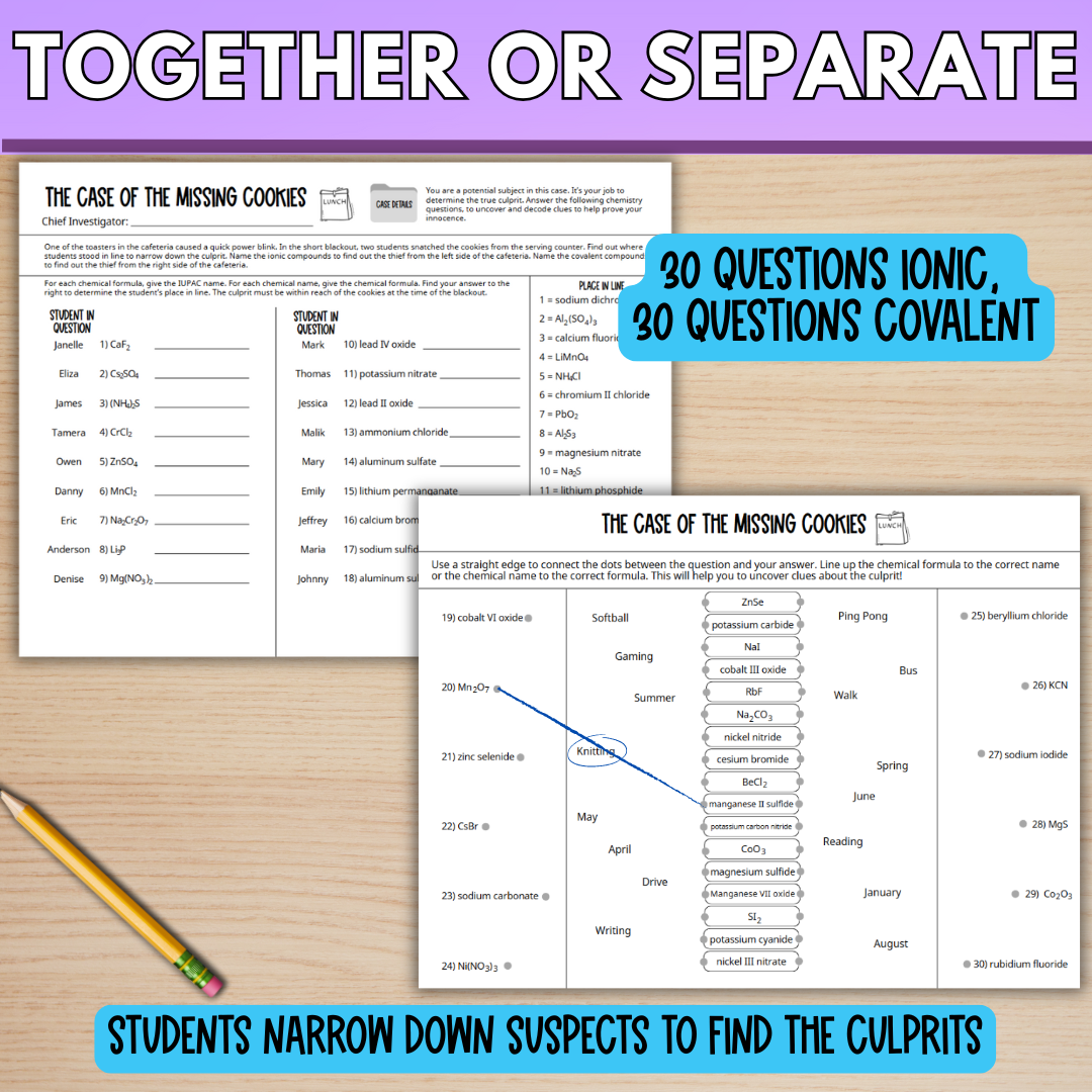 This fun and engaging chemistry mystery on the topic of ionic and covalent chemical nomenclature! Students work as a whole class to uncover the culprit of the missing cookies from the cafeteria.