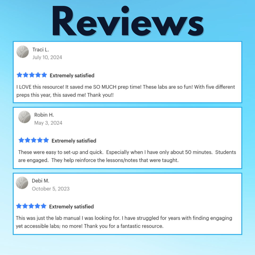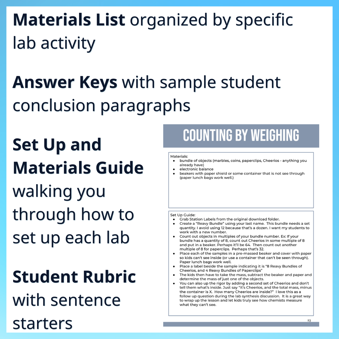 Chemistry labs are tough to come by and often have a laundry list of specific chemicals you'll need to make them happen. This lab book is a full year's worth of chemistry lab activities with a very simple list of materials you'll need. In fact, I was able to do upwards of 90% of these labs in my art classroom turned chemistry "lab." This very easily could be translated to a homeschool chemistry lab book or chemistry lab manual- most of the materials are so simple you could use them in your kitchen!