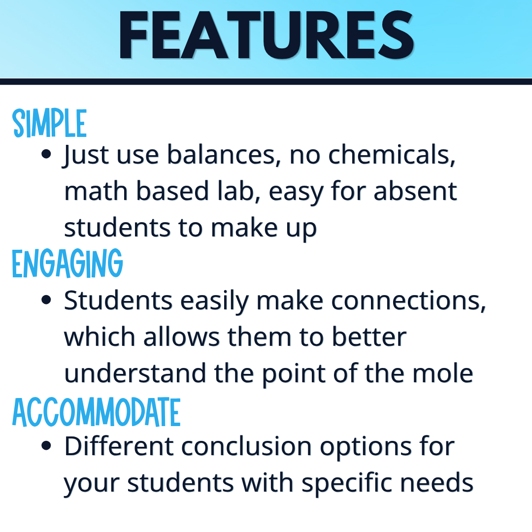 Students gain a deep understanding of the mole concept and its necessity in science while measuring things they can't see. This lab is very simple to set up, and is chemical free, making it super budget friendly! Students are given a very simple procedure and are expected to write a more detailed procedure as they work to determine the mass of just one item in each bundle.