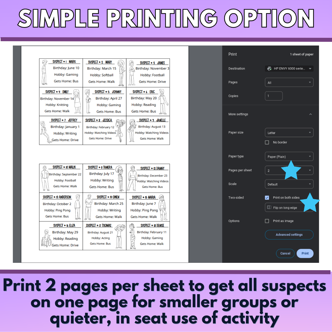 - Whole class activity or individual activity based on how you decide to print/distribute suspect cards.